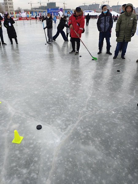 運動會設置了冰球射擊、雪圈投擲、冰車大作戰、冰壺撞擊、抽冰陀螺5個項目,形式簡單、易于參與、趣味性強。現場,冰壺、冰球射門設施擺滿了整個場地,職工們躍躍欲試。運動會上,集團公司運動員不懼嚴寒,團結一致、相互鼓勵,充分享受著運動帶來的樂趣,也在運動中加深了對冰雪運動的熱愛與了解。