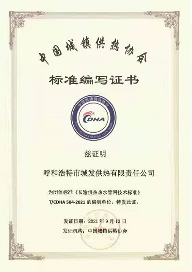 近日,集團公司收到參與《長輸供熱熱水管網技術標準》編寫證書。